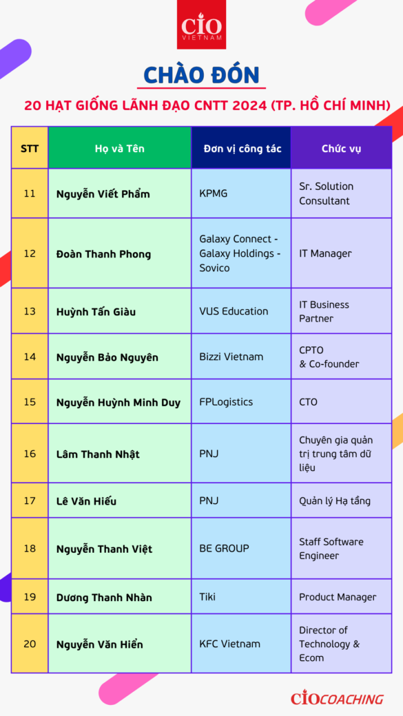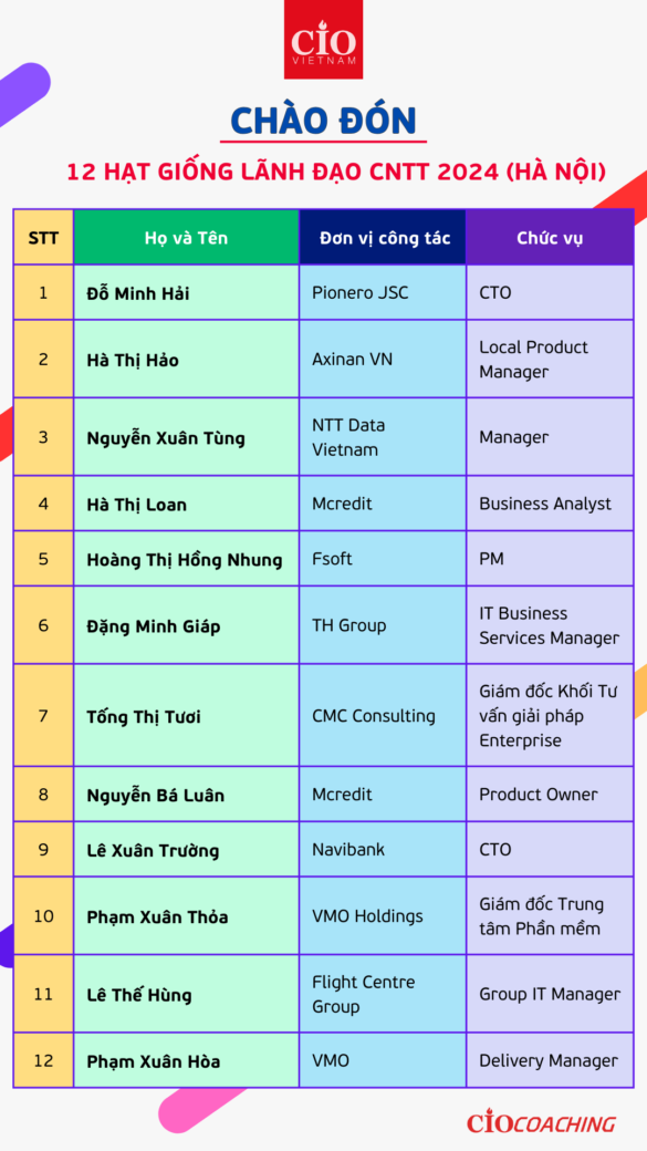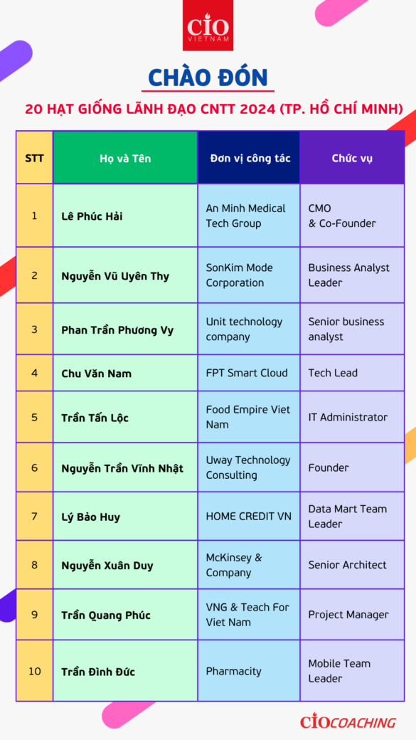 Thay mặt cộng đồng CIO Vietnam và Ban huấn luyện chương trình “Hạt Giống Lãnh Đạo CNTT”, ban tuyển sinh hân hoan thông báo và chúc mừng các ứng viên (danh sách được đính kèm trong các hình ảnh bên dưới) đã được chọn để trở thành Hạt giống của chương trình huấn luyện mùa 8 năm 2024.